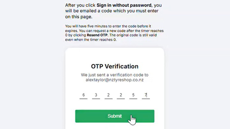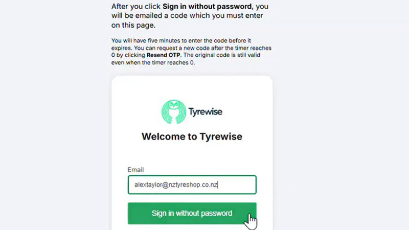 Enter the e-mail address associated with your Tyrewise account (example below) and click ‘Sign in without password’. A six-digit code will be sent to your email – this may take a few minutes.