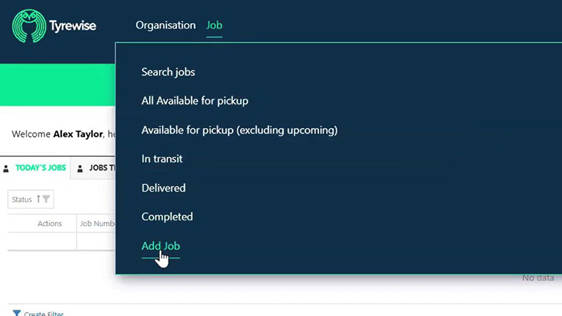 To book a tyre collection click on ‘Job’ on the top left of the screen, and then click ‘Add Job’.