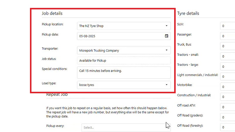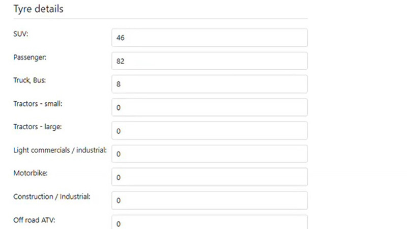 Under ‘Tyre details’ enter the number of tyres which need to be picked up next to the types of tyres (example below). This can be a round number/best estimate.