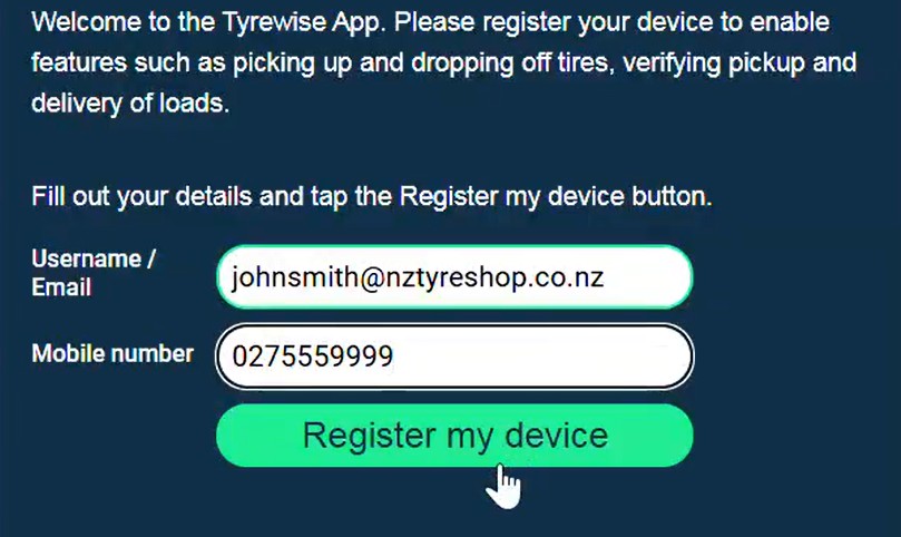 Enter the e-mail address and phone number associated with your Tyrewise account (example below) and click ‘Register my device’ to log in. Please note: the phone number you have registered with Tyrewise may be a mobile or landline number. If you are unsure, please get in touch to check.