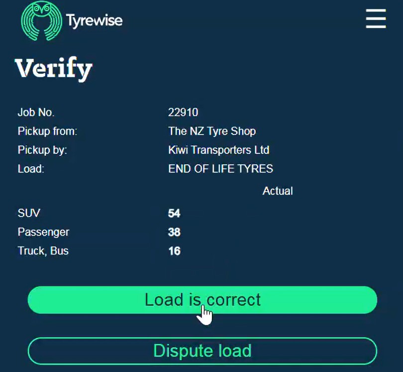 Review the tyre types and tyre counts that the driver entered. If this is correct click ‘Load is correct’, and the button will change to ‘Saved!’ You’re all done.'