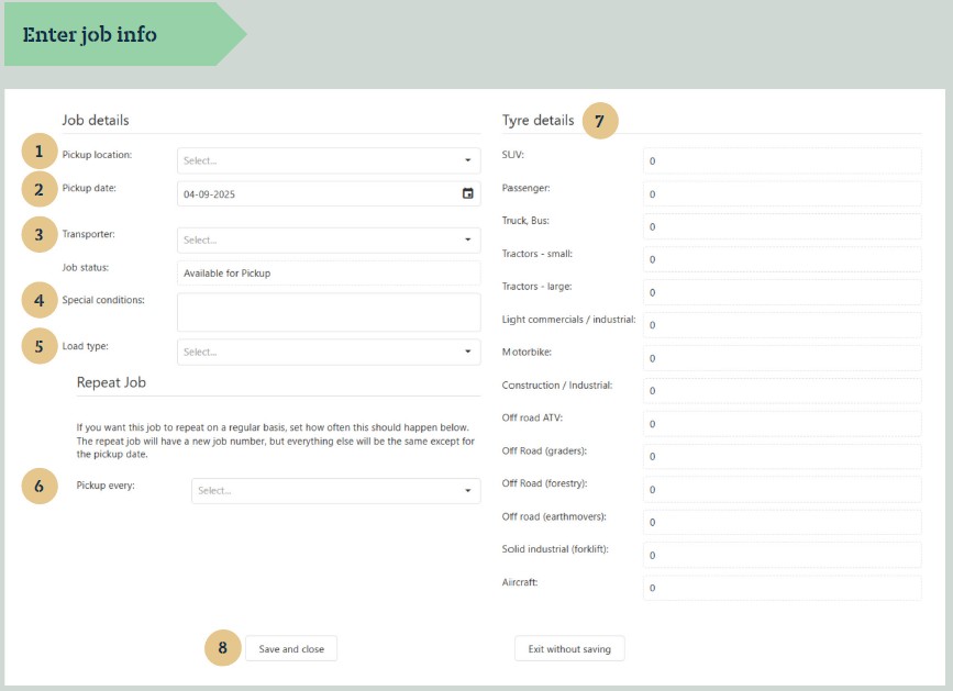 - Doesn't need to be exact; driver will enter actual tyre counts during job pickup