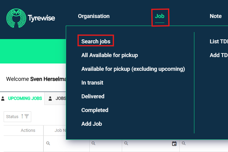 Log into admin.tyrewise.co.nz and click the 'Job' heading at the top of the page and then click 'Search jobs'.