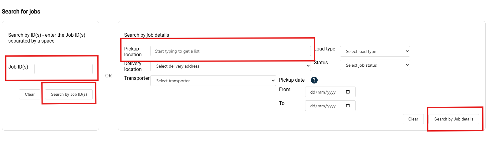 Enter your business name in the Pickup location field and click Search by Job details. Or, enter the job number (if known) in the Job ID(s) field and click Search by Job ID(s).