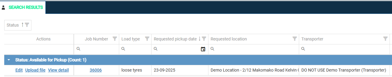 Clicking on the wording 'Status: Available for Pickup' will drop down further information options, such as the option to edit the job. NOTE: Editing is limited to functions such as updating tyre numbers. If you want to change transporters you will need to get in touch with Tyrewise.